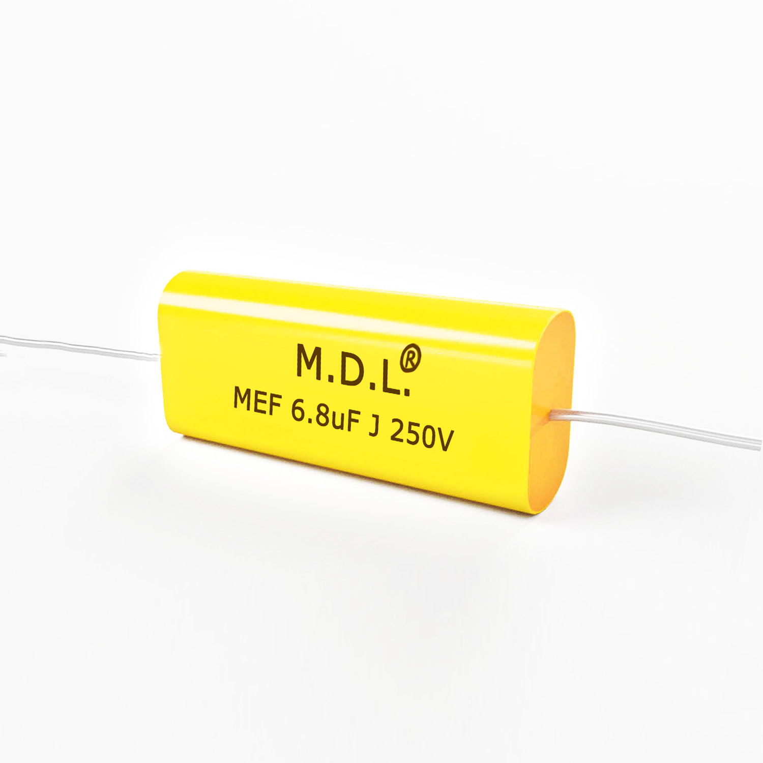 M.D.L. MEF Series metallized polyester film capacitors are high-performance electronic components, specially designed for use in crossover networks and other high-precision applications. These capacitors feature high-quality polyester film as the dielectric, and high-purity aluminum metal is plated on the film surface through a vacuum metallization process. This design not only provides excellent electrical performance, but also has excellent electro-acoustic performance and reliability. They are the ideal choice for crossover network applications, as they can offer a wide range of capacitance, high accuracy, low distortion and good temperature stability.