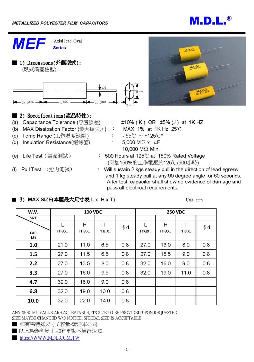 MDL MEF Series Metallized Polyester Film Capacitors, Non-Inductive