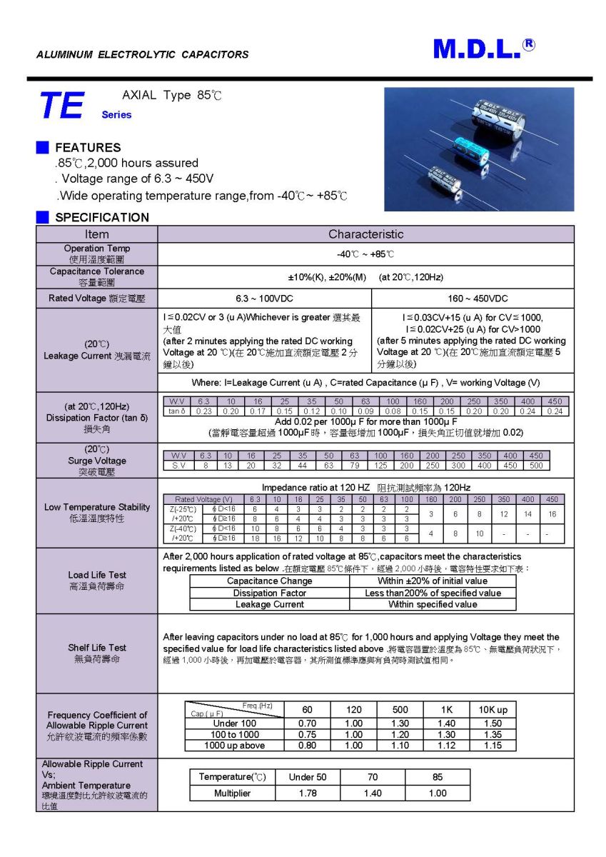TE Series Axial Type Aluminum Electrolytic Capacitors -40°C ~ +85°C